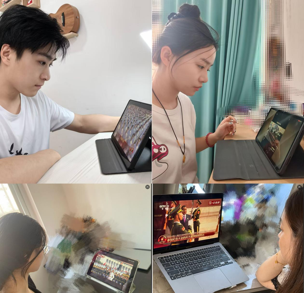 在外实习的毕业班同学也通过电脑或手机等设备同步观看了阅兵直播,一名正在实习的同学表示:“虽然不能和大家一起在公司观看,但通过电脑看到阅兵仪式的磅礴气势与壮观场面,我依然感到无比自豪和振奋,这是一次非常有意义的爱国主义教育。”