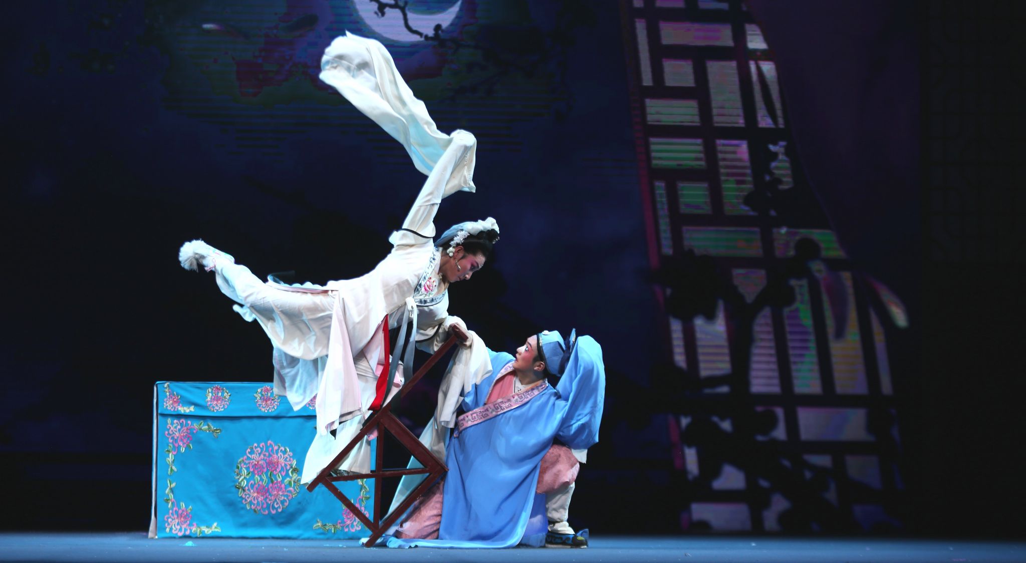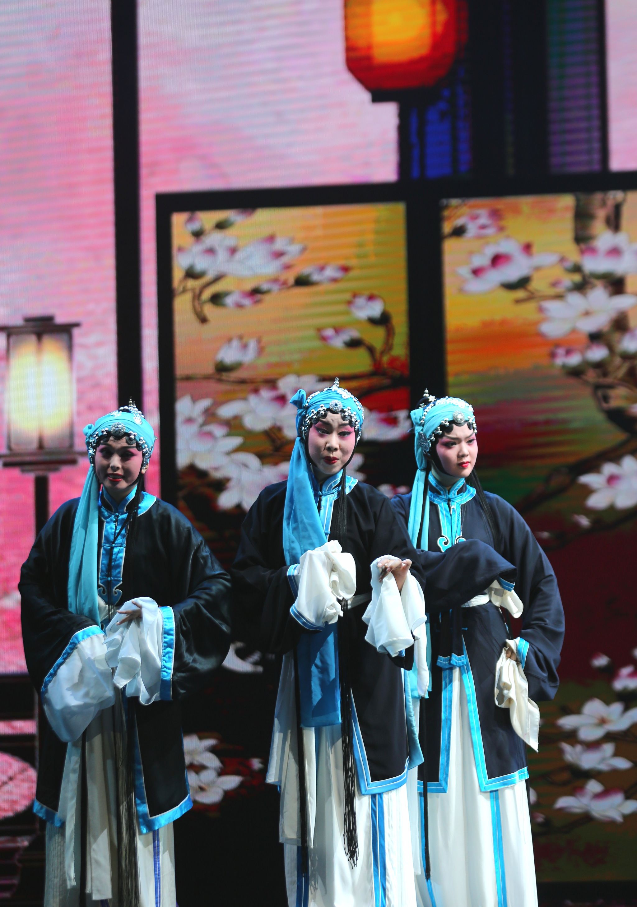 整场演出在灵动脱俗的戏曲舞蹈云裙水袖中拉开帷幕。公司学子依次上演了《别洞观景》《打金砖》《青萍刺目》《渔网会母》《陈三两爬堂》《活捉》《状元府》《投江》《扈家庄》等黄梅戏经典折子戏,此外还有花鼓灯《抢板凳》等极具徽风皖韵的经典作品。