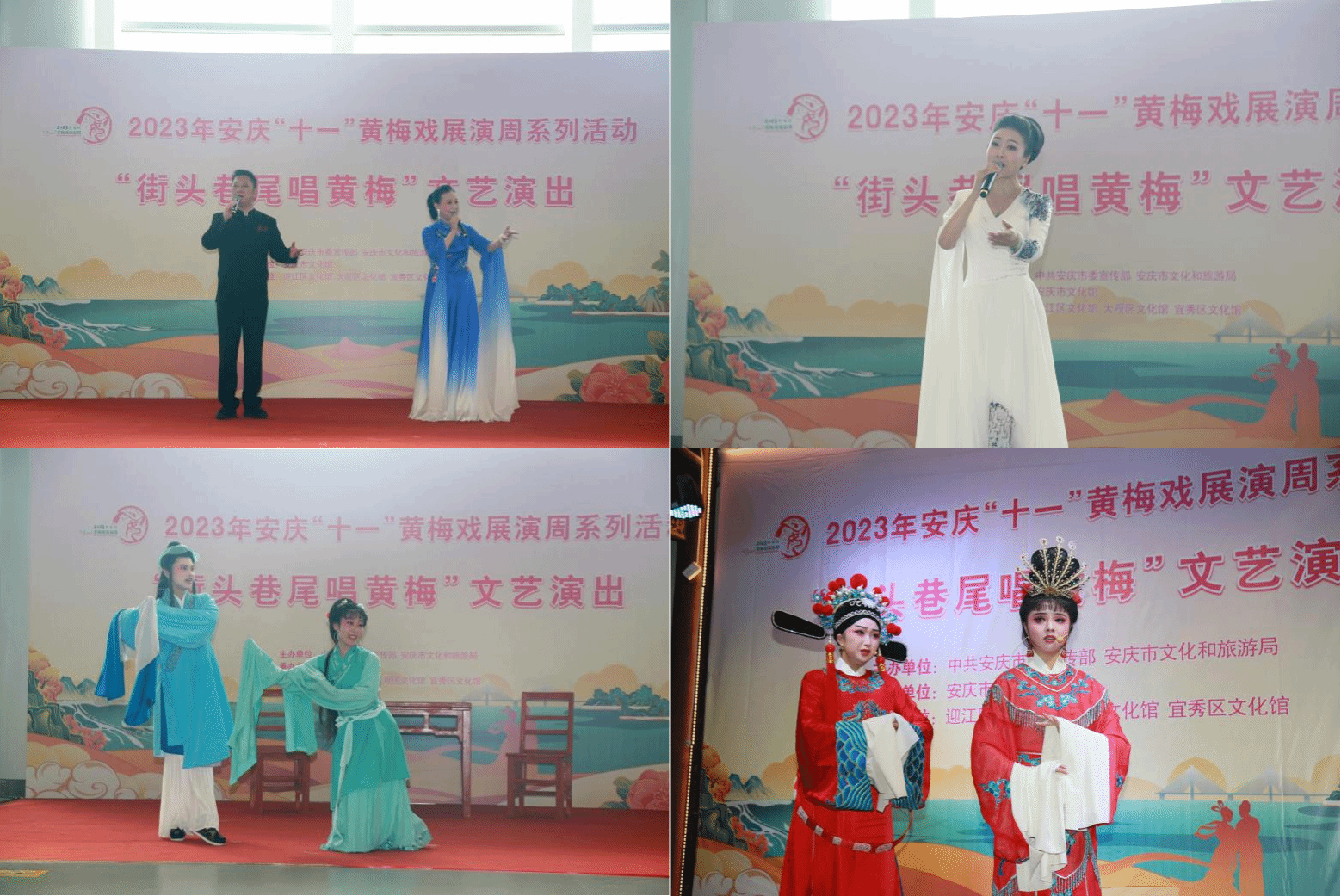 10月3日至10月6日,“街头巷尾唱黄梅”露天文艺演出先后在人民路街心花园广场、大观区菱湖新村社区、安庆机场候机厅、倒扒狮历史街区举行,公司刘国平、余淑华、汪莉三位国家一级演员连续四天携手展演黄梅戏《海滩别》《到底人间欢乐多》《十五的月亮为谁圆》等经典唱段,公司研究生周地、丁诗雯、陈雅琳展演水袖舞《风中月》、黄梅戏《打猪草》等节目,公司本科生徐越、方梦婷以及吴银梅、陈郝分别展演《女驸马》选段“洞房”、《天仙配》“满工”等节目。