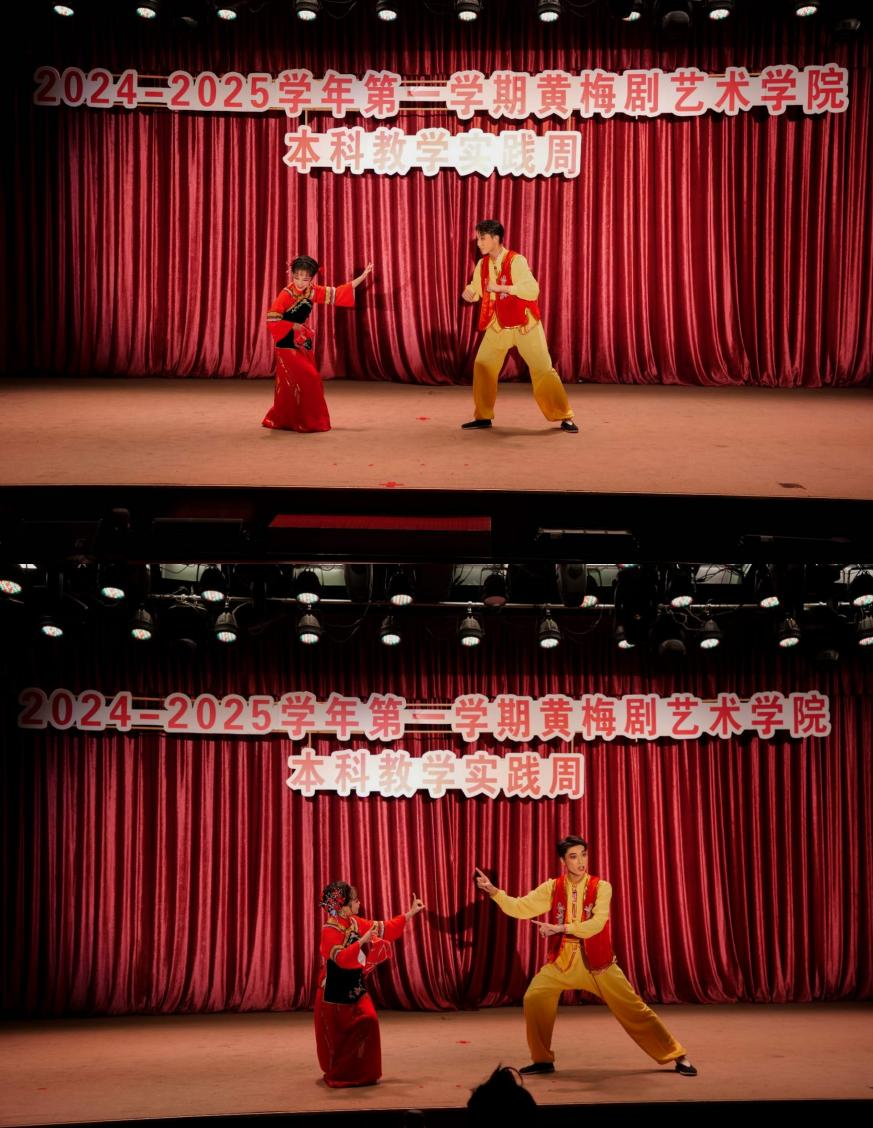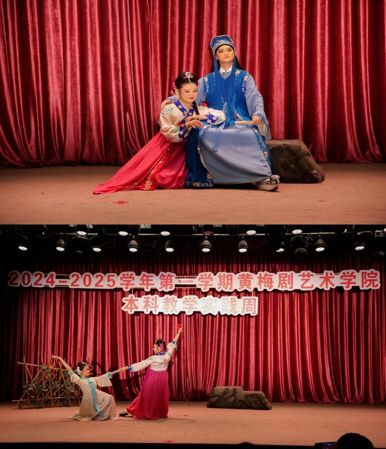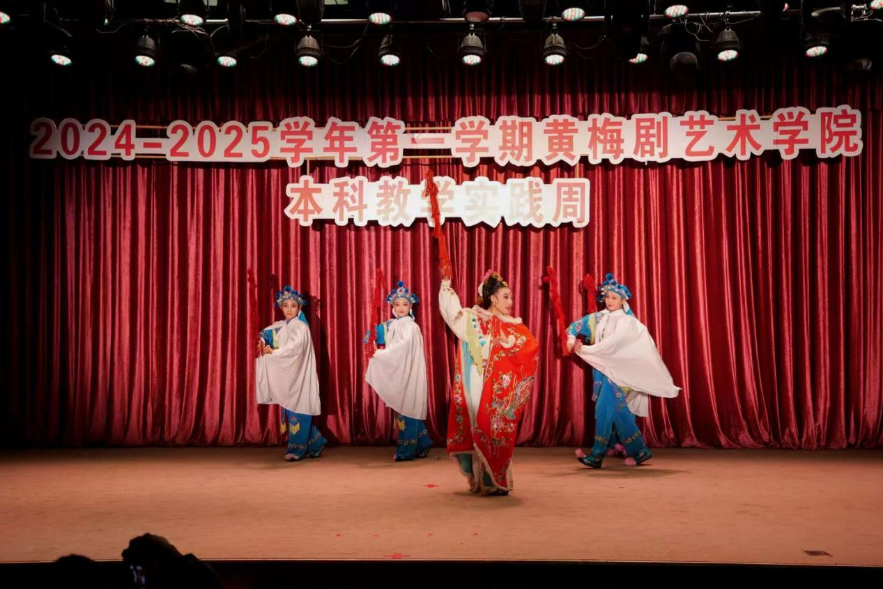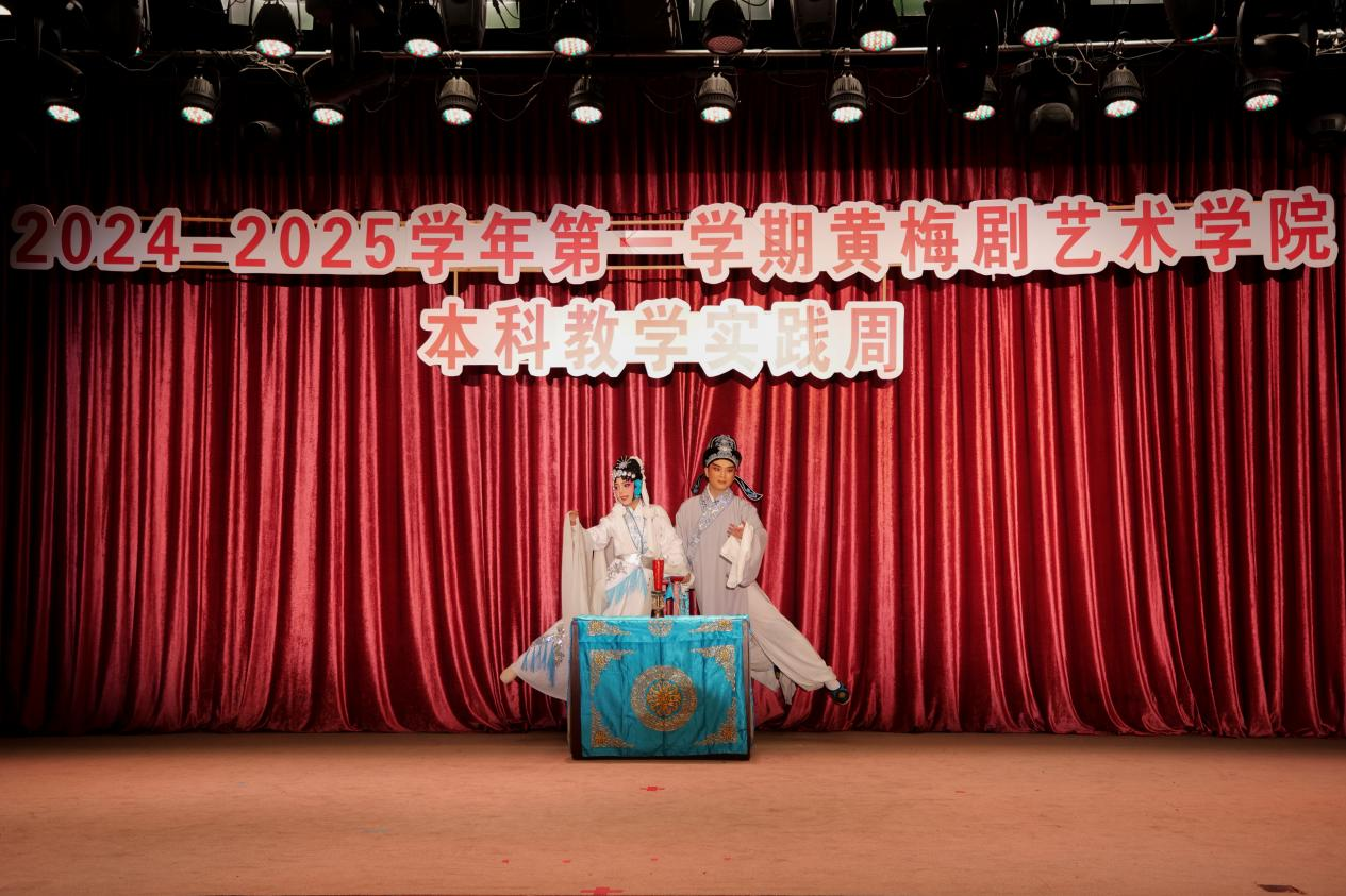 本次实践周专场演出以黄梅戏经典折子戏为主,展演在灵动脱俗的水袖组合中拉开帷幕。裴胜男、马来文《闹花灯》充满生活趣味,何珊珊《扈家庄》展现巾帼风采,苏紫晨、宁天翔《满工》传达动人情感,王默涵、赵士凡《夜奔》展示扎实功底,潘钰瑶、朱文豪《楼台会》演绎惊艳唱腔,李新悦《劈棺惊梦》,李思佳《渔网会母》,谢娜、贺子杰《打焦赞》,方祖鸿、牛梦龙、聂冰馨《春香传》等都充分展现唱念做工,热闹场面赢得观众阵阵喝彩。
