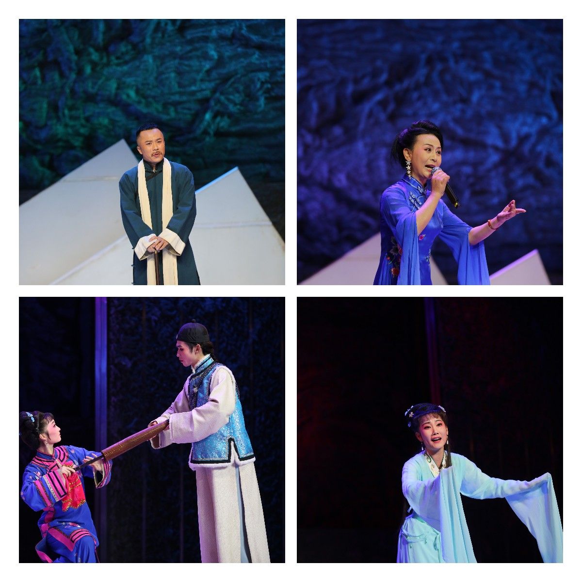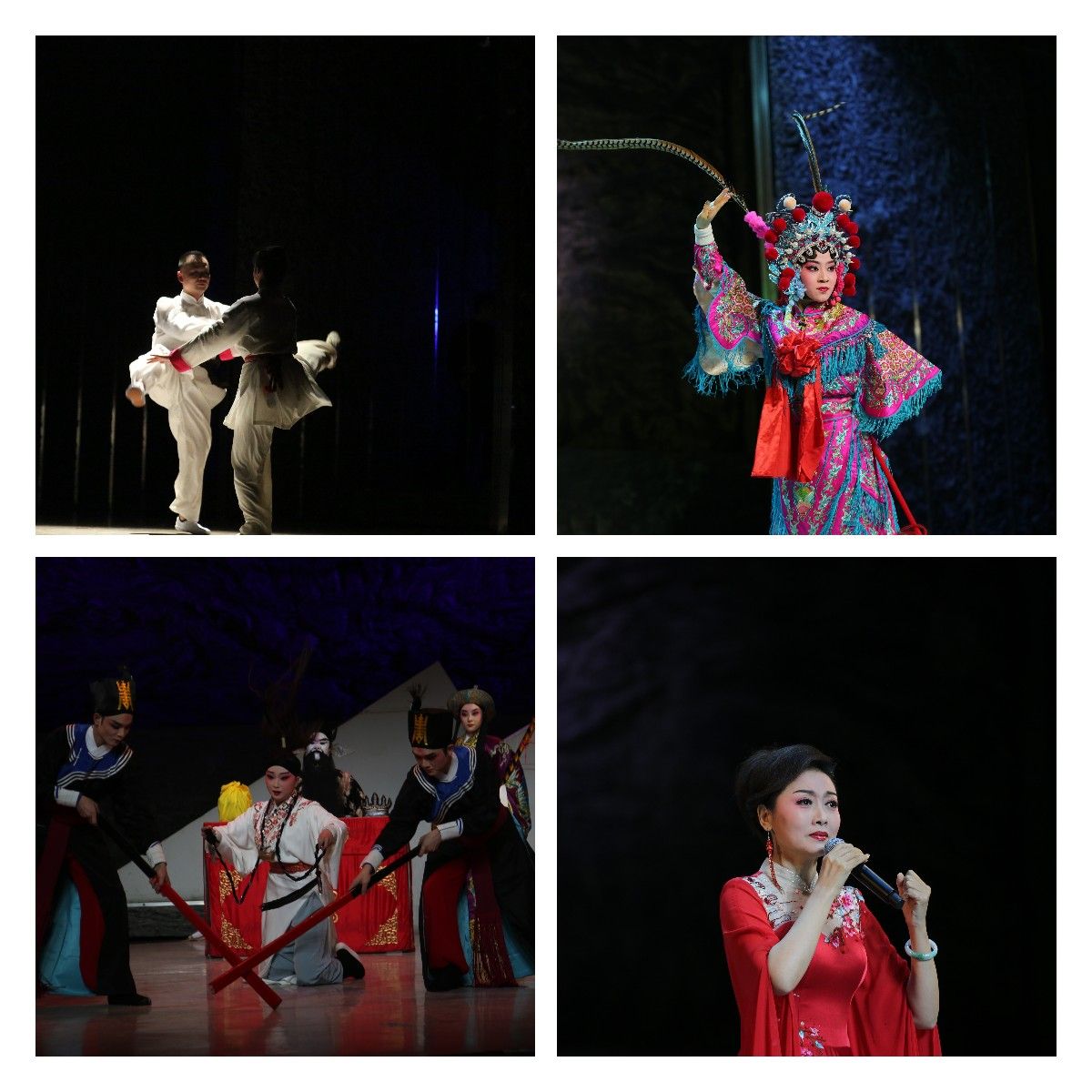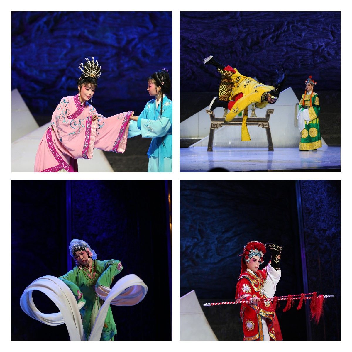 整场演出在灵动脱俗的水袖组合中拉开帷幕,师生们依次表演了《金鳞记》《汉宫秋》《风尘女画家》《打金砖》《荆钗记》《孟姜女》《扈家庄》《谢瑶环》等黄梅戏经典剧目选段,《打金砖》 “太庙”中陈郝同学繁复的“甩发”动作,吊毛、抢背、倒仆虎、倒僵尸,一气呵成,赢得现场声声喝彩。余淑华老师表演《渔网会母》中的经典名段“左牵男右牵女”,汪莉老师和员工合演《小辞店》中的经典名段“蔡郎哥哥他要走”,方骏老师和员工联合展示了戏曲演员基本功,刘丽老师表演《木兰从军》选段,一再将晚会推向高潮,线上线下观众一片叫好。