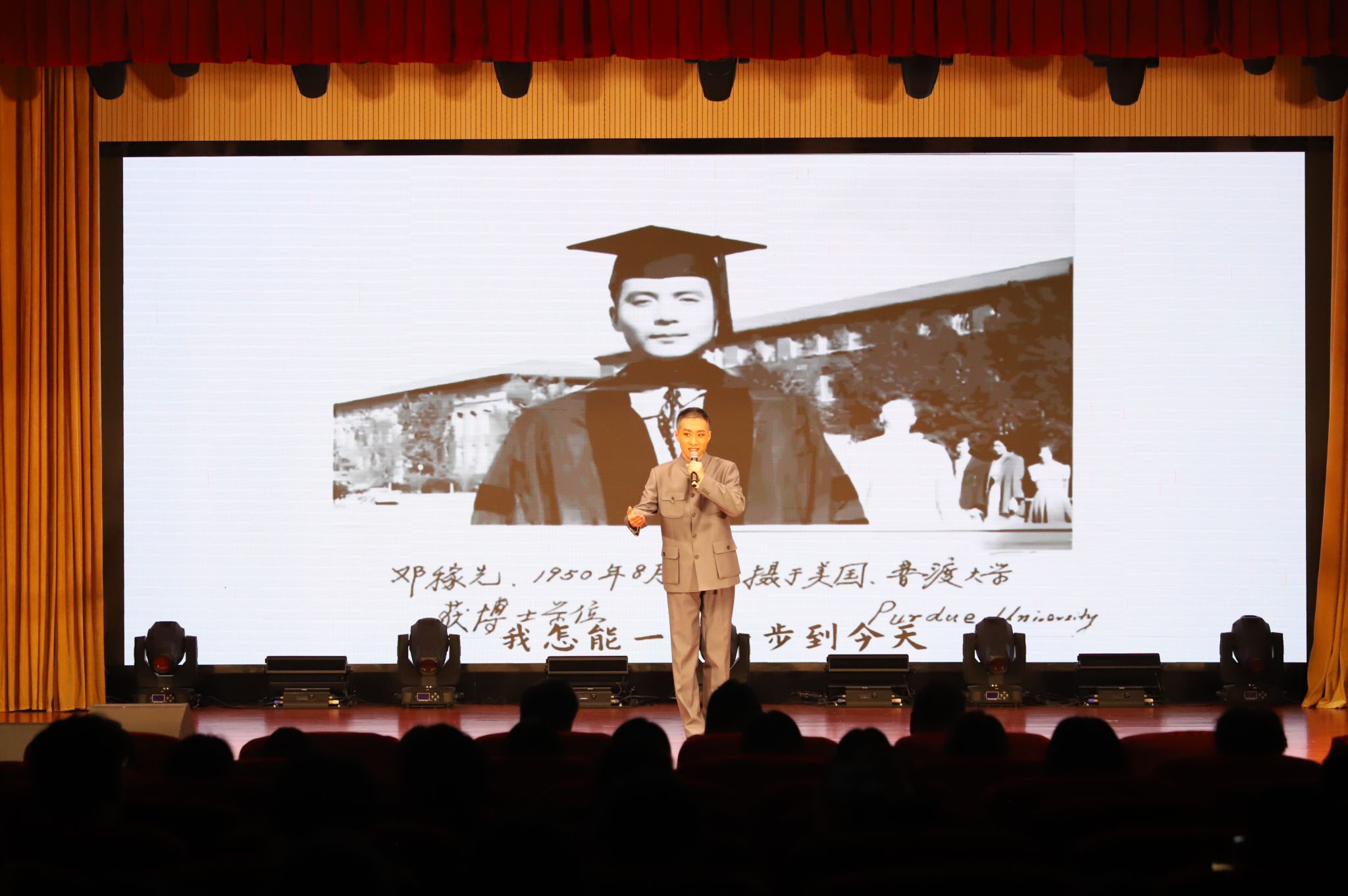 此外,在公司黄梅戏艺术团赴中国科学技术大学的专场展演中,中科大戏剧社24级微尺度物理学专业的研究生赵博文为观众们带来了精彩的特别展演《邓稼先》选段——《只为这一天》。舞台上的邓稼先虽然两鬓斑白,身形消瘦,但句里行间吟唱的都是对伟大祖国深厚的爱。“我很荣幸有机会演唱饱含科学家精神的黄梅戏唱段《只为这一天》,”赵博文说,作为一个业余的黄梅戏爱好者,很荣幸这次表演能得到刘国平老师的耐心教学和悉心指导。