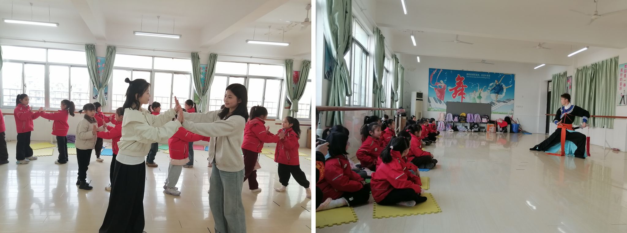 活动在一段气势磅礴的《林冲夜奔》选段中拉开帷幕。演员凭借扎实的功底和细腻入微的表演,将林冲在风雪中奔逃的紧张与无奈展现得淋漓尽致。一招一式皆有乾坤、一颦一笑尽显风情,充满戏曲独有的韵味,引得台下的同学们目不转睛,掌声连连,不绝入耳。随后的教学环节,从简单的手势、台步,到富有特色的唱腔,孩子们踊跃参与,积极模仿,现场气氛十分活跃,孩子们天真烂漫的脸上洋溢着对黄梅戏浓厚的兴趣和热情。